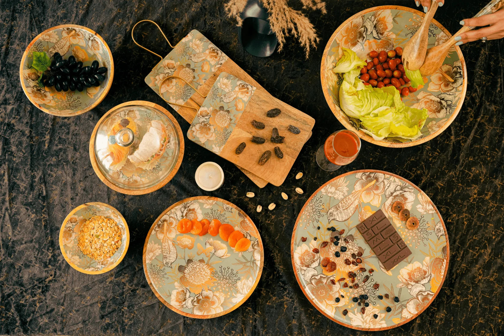 The "Golden Nightingale" design is a luxurious and enchanting print that features delicate nightingales perched among intricately detailed flowers and foliage. The artwork is rendered in a sophisticated palette of muted gold, bronze, and rich earth tones, set against a serene, soft greenish-blue background. The intricate linework of the flowers and birds is highlighted with subtle golden accents, giving the design a timeless elegance and a touch of opulence. The overall effect is a harmonious blend of nature's beauty and artistic refinement, making it a perfect choice for serveware that adds a touch of luxury to any dining experience. This design is ideal for creating pieces that are not only functional but also serve as captivating centerpieces in your home decor.