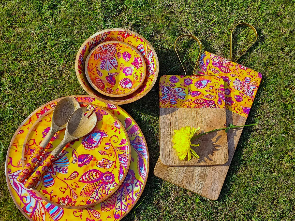 "The Yellow Mellow" design is a striking blend of cultural influences and natural elements, brought together in a colorful and intricate pattern that makes the serveware both functional and visually appealing.